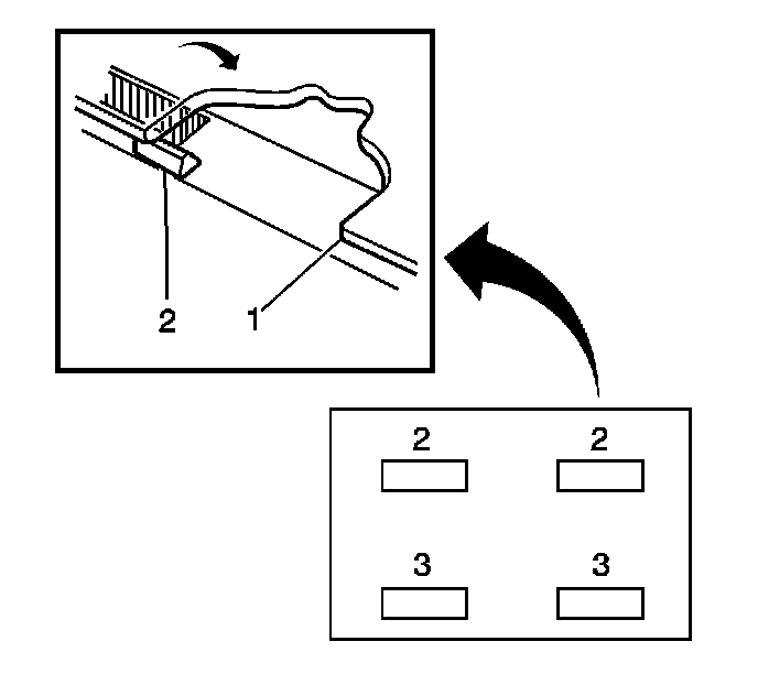 Important: When installing spacers (2) and/or blocks (3) space them equally around the quarterwindow, backwindow or the liftgate window (1) to aid in the height set, if equipped.