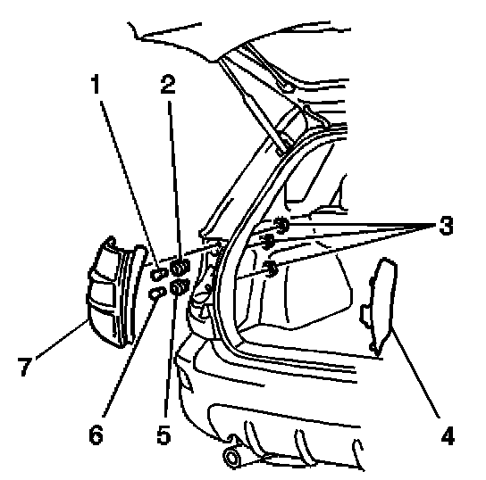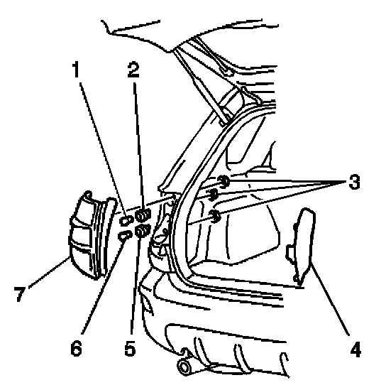 3. Install the tail lamp (7) to the vehicle. Secure the tail lamp (7) with the 3 nuts (3).
