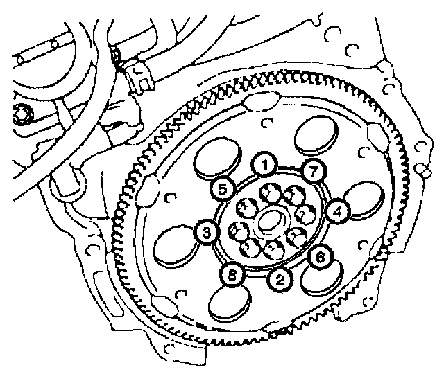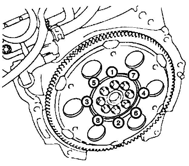 ^ Tighten the eight flywheel retaining bolts in sequence for Automatic Transmission to 83 Nm (61 lb ft).