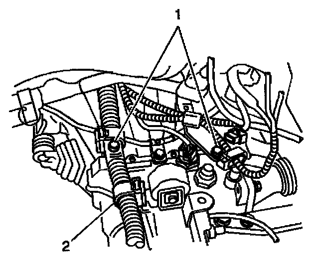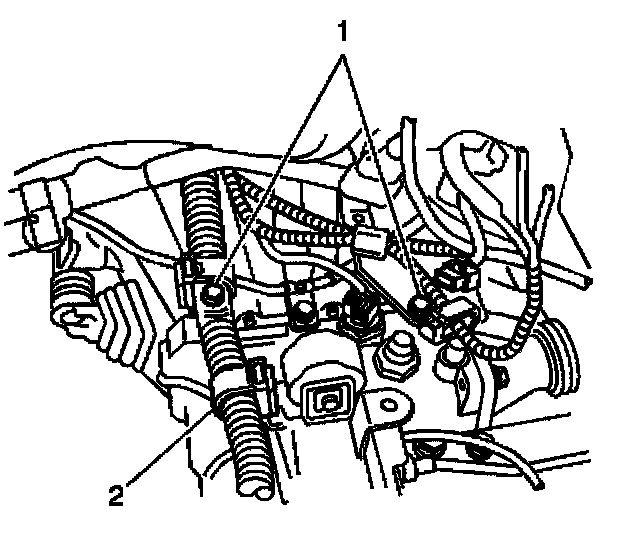 8. Remove the 2 bolts, then disconnect the 2 wire harness brackets (1).