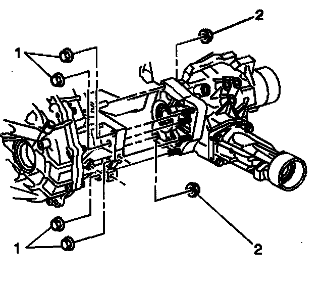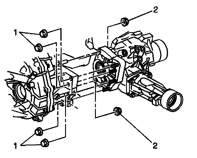 6. Install the 6 transfer case-to-transaxle nuts (1 ) and (2).