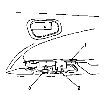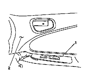 1. Using a taped flat bladed tool, gently pry the front side door accessory switch mounting plate (2) from the front side door trim (1).