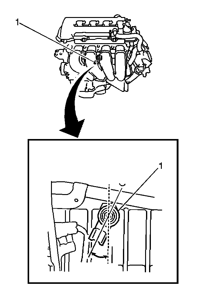 3. Align the KS (1) on the engine block as illustrated. The KS electrical connector cavity must point down, in a 15-30 degree arc from perpendicular to the earth.