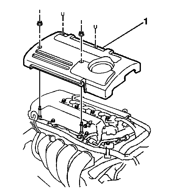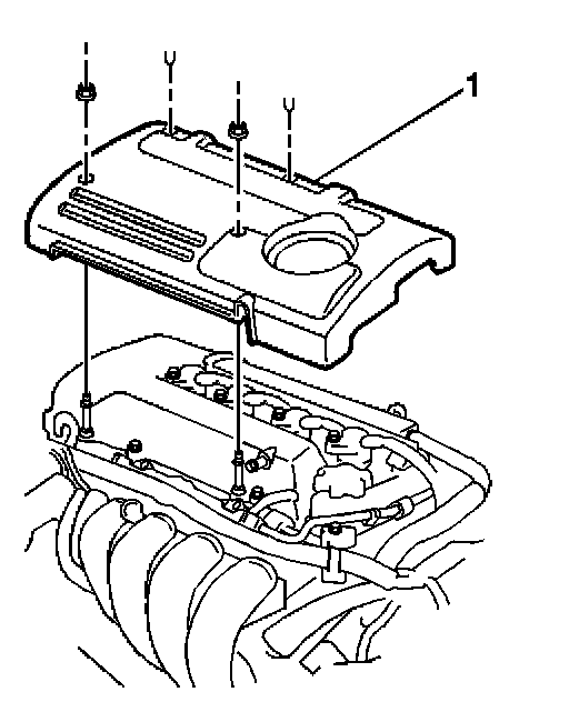 5. Install the engine cover (1) to the cylinder head cover. Secure the engine cover with the 2 clips and the 2 nuts.