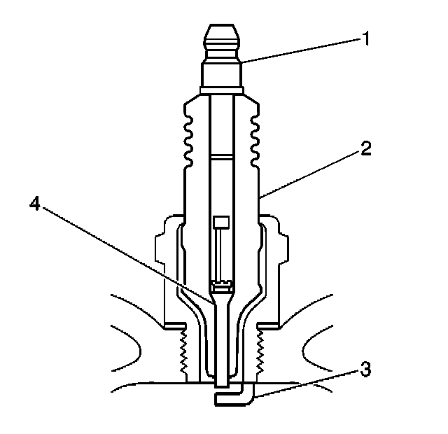 - Measure the gap between the center electrode (4) and the side electrode (3) terminals. Refer to Ignition System Specifications . An excessively wide electrode gap can prevent correct spark plug operation.