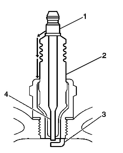 - Inspect for signs of tracking that occurred near the insulator tip instead of the center electrode (4).