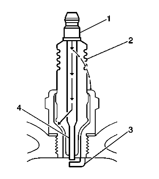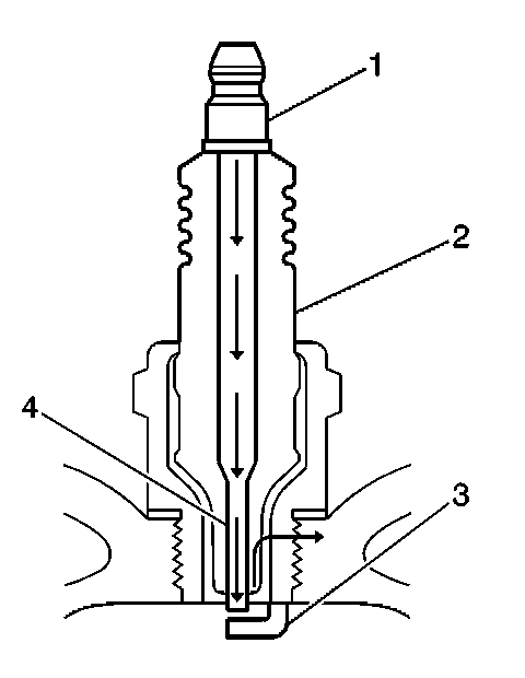 - Inspect the insulator (2) for cracks. All or part of the electrical charge may arc through the crack instead of the electrodes (3, 4).