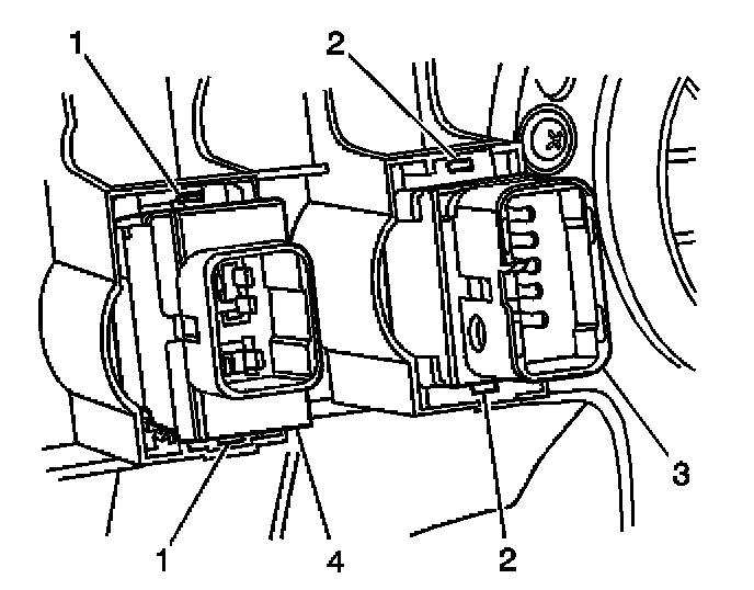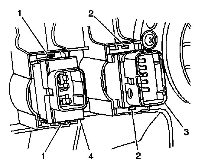 3. Press down on the tabs (1) and remove the defogger switch (4) from the IP center trim panel.