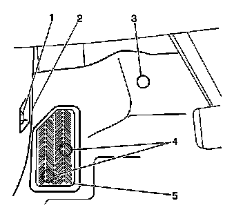 1. Install the foot rest (5) to the floor panel studs. Secure the foot rest, by fastening the 2 plastic retainers (4).