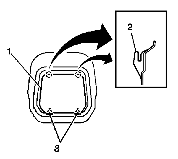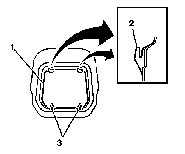 1. Using a flat-bladed tool, disengage the 2 lower plastic retainers (3) from the trim panel (1).