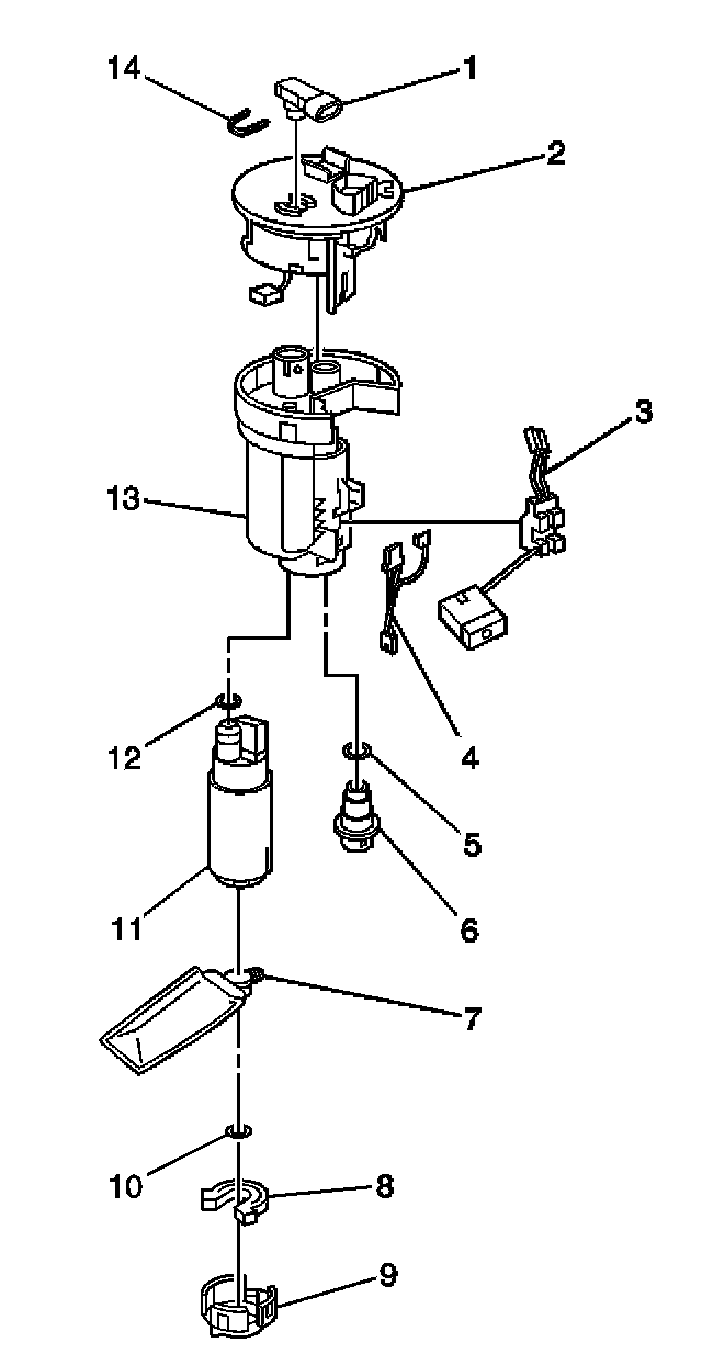 7. Install the fuel sender assembly top cap (2) to the fuel filter assembly (13). The fuel sender assembly end caps snap into place.