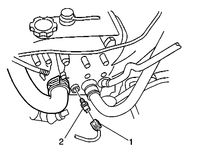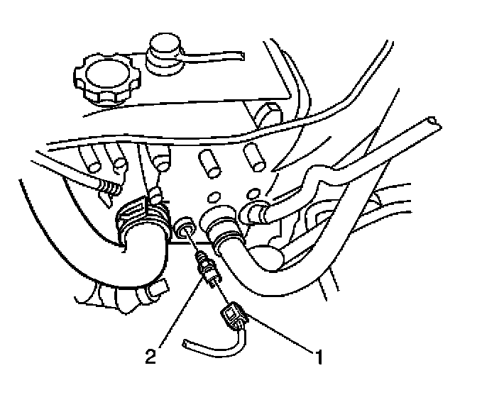 2. Disconnect the ECT sensor electrical connector (1) from the ECT sensor (2) located next to the upper radiator hose on the cylinder head.