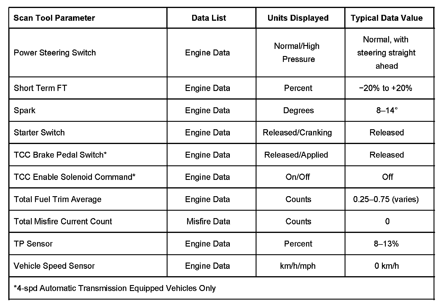 The Engine Scan Tool Data List contains all of the engine related parameters that are available on the scan tool. The list is arranged in alphabetical order.