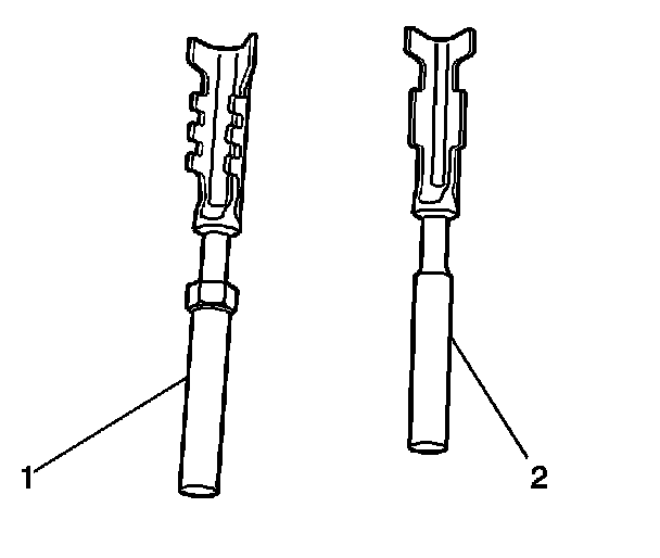 IMPORTANT: There are 2 styles of Micro-Pack 100W terminals which are very similar. Ensure that you have the correct terminal before crimping the new terminal to the wire. The first design connector uses the longer terminal (1) that has a raised area in front of the recess in the terminal. The second design connector uses the shorter terminal without the raised area.