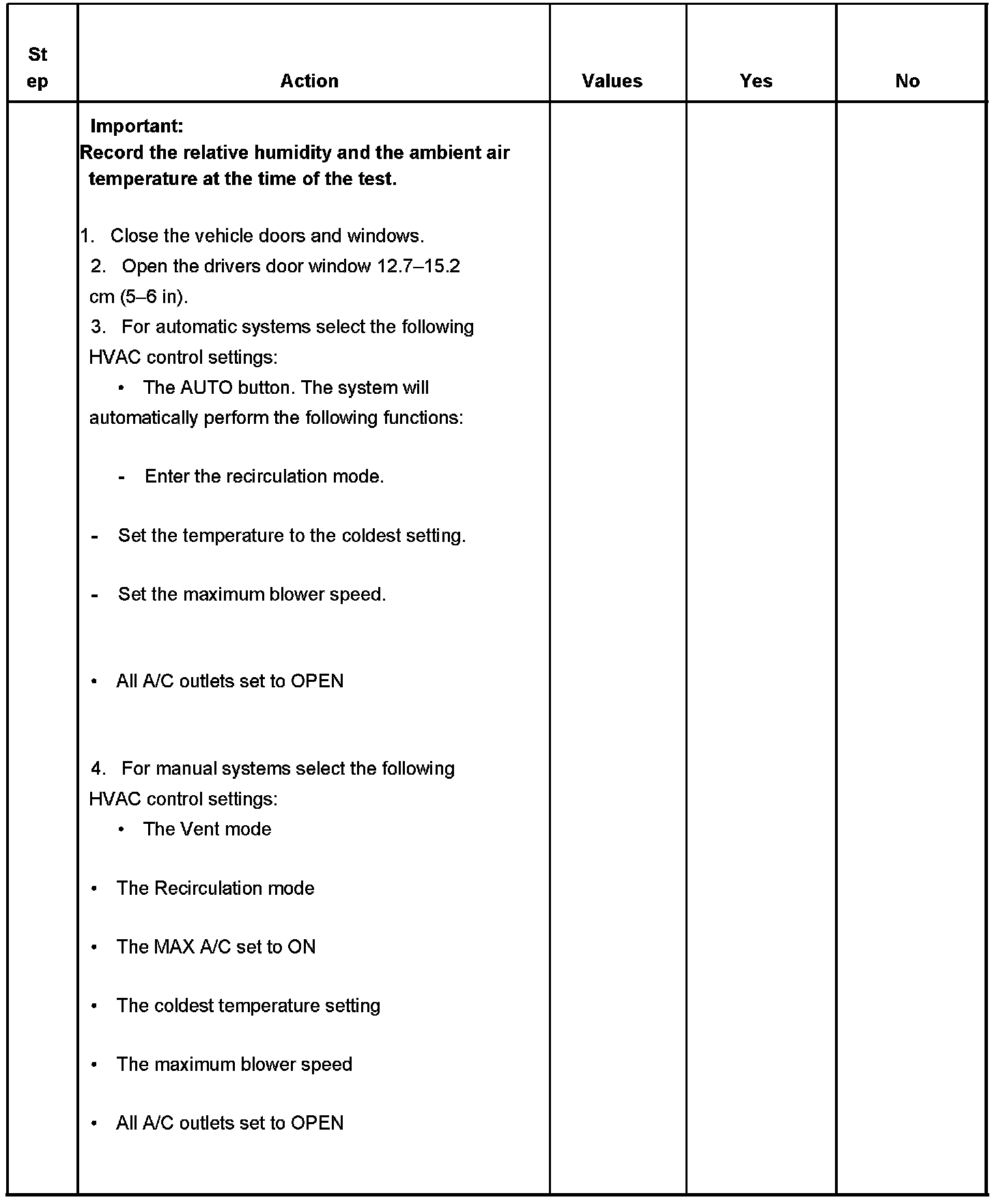 AIR CONDITIONING (A/C) SYSTEM PERFORMANCE TESTThis test measures the operating efficiency of the A/C system under the following conditions: