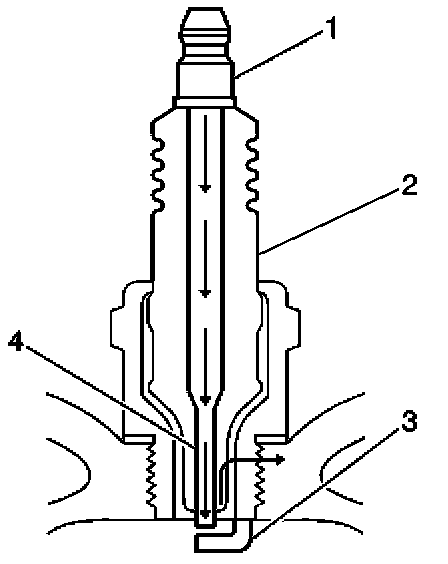 - Inspect the insulator (2) for cracks. All or part of the electrical charge may arc through the crack instead of the electrodes (3, 4).
