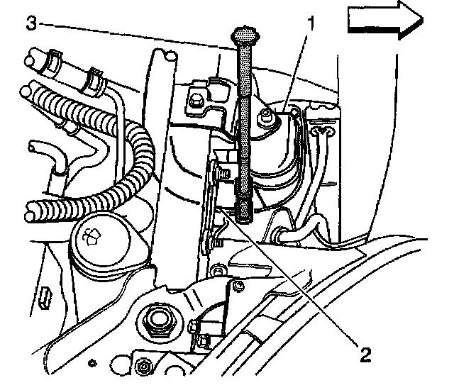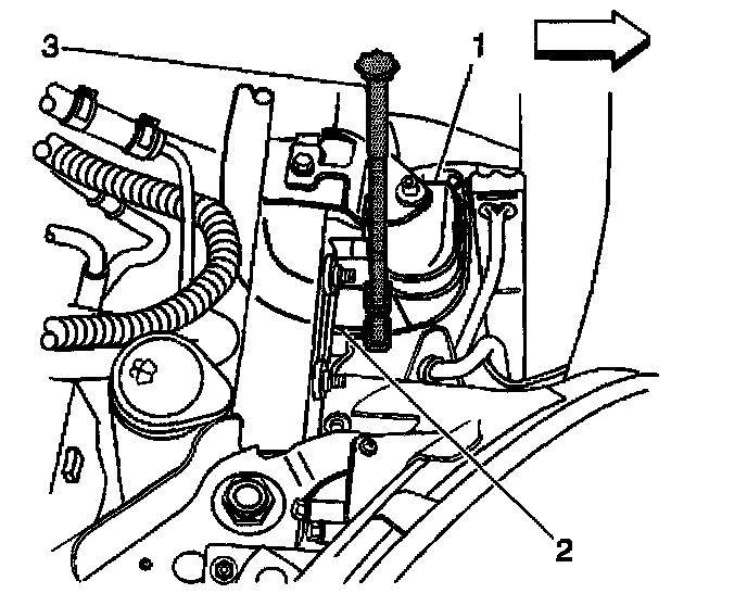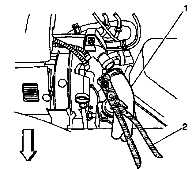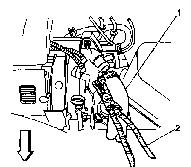 3. Position the J 38185 on the hose clamp and reposition the hose (1) to the engine.