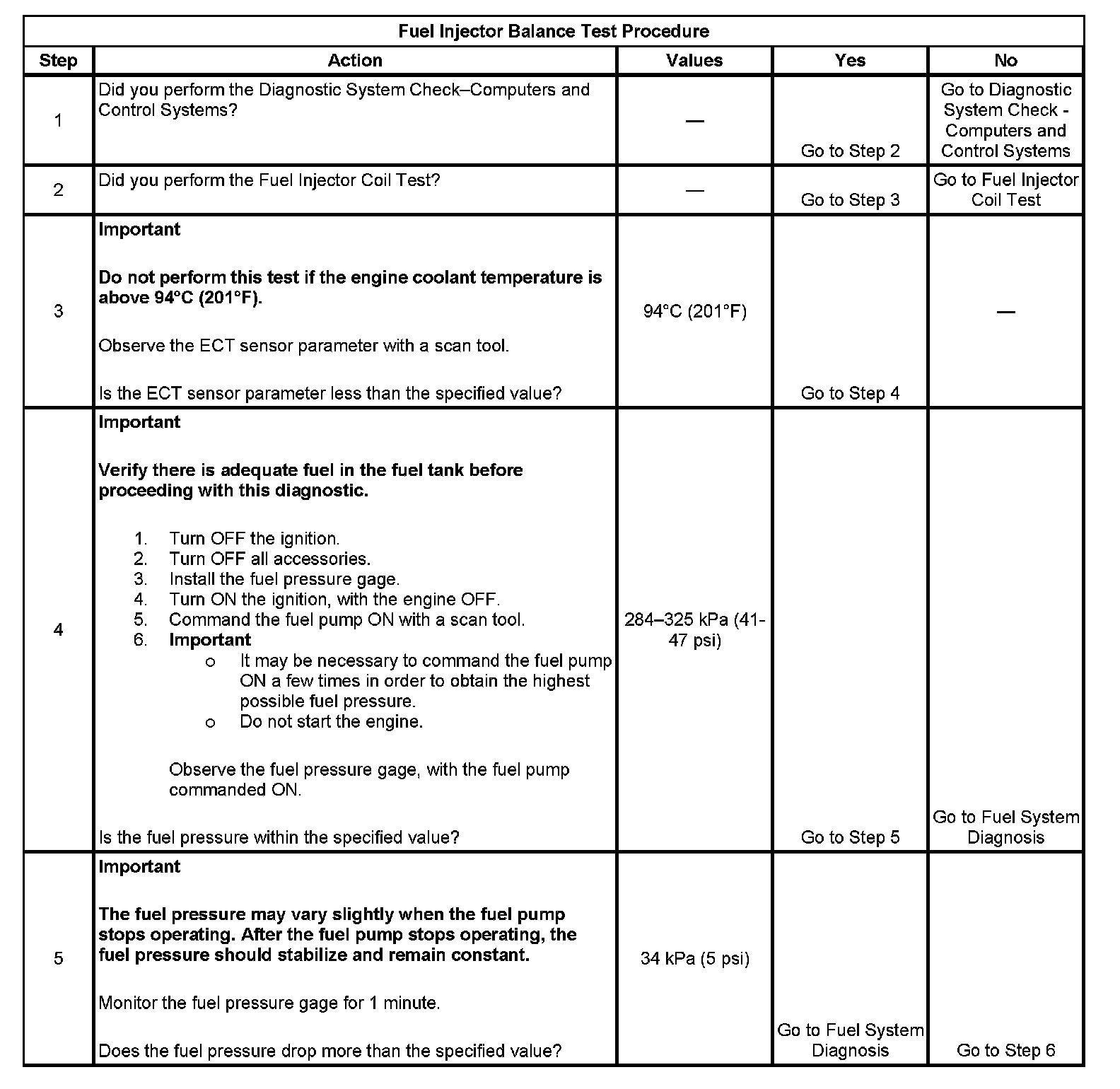 4. The fuel pressure should be within the specified range. Refer to Fuel System Diagnosis if the fuel pressure is not within the specified range. Component Tests and General Diagnostics