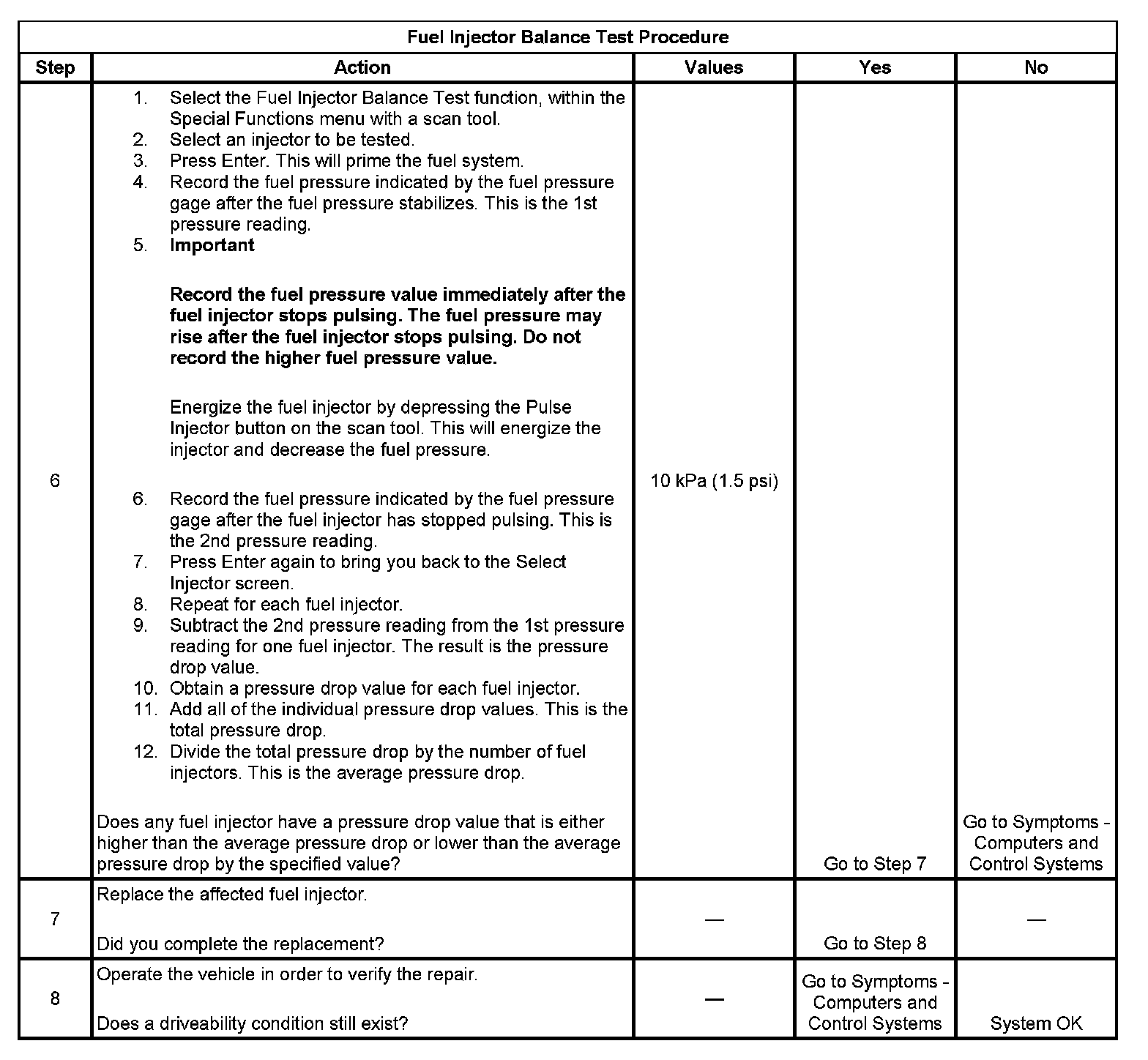 6. If the pressure drop value for each fuel injector is within 10 kPa (1.5 psi) of the average pressure drop value, the fuel injectors are flowing properly. Calculate the pressure drop value for each fuel injector by subtracting the second pressure reading from the first pressure reading.