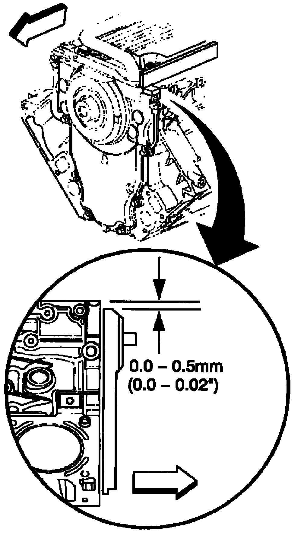 7.2. Insert a feeler gage between the front cover and the straight edge tool. The cover must be flush with the oil pan surface or no more than 0.5 mm (0.02 inch) below flush.