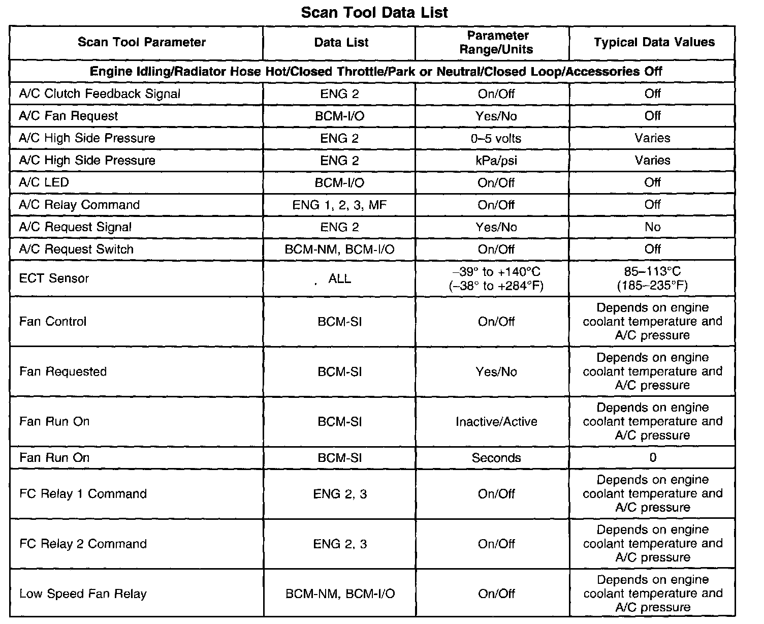 Scan tool values from a properly running engine may be used for comparison with the engine you are diagnosing. The Engine Scan Tool Data List represents values that would be seen on a normally running engine.