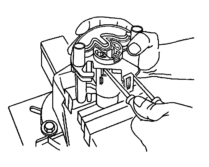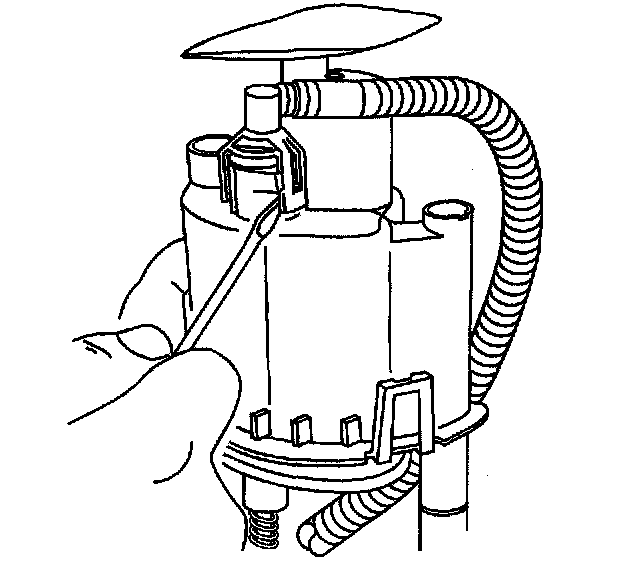 7. Pry open both tangs securing the fuel outlet connector to the bottom of the motor and filter assembly, then remove the fuel outlet pipe from the motor and filter assembly.