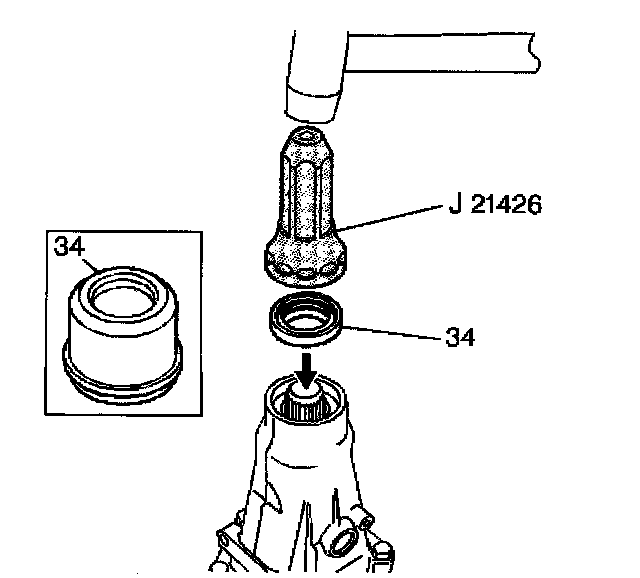 8. Using the J 21426, install the case extension oil seal assembly (34) (model dependent).