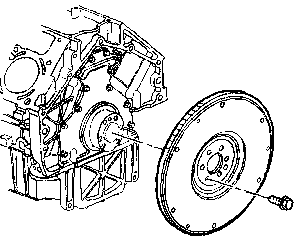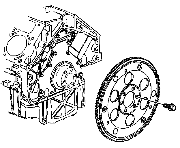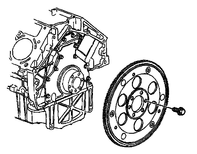 Important: Note the position and direction of the engine flywheel before removal. The flywheel does not use a locating pin for alignment. Mark or scribe the end of the crankshaft and the flywheel before component removal. The engine flywheel will not initially seat against the crankshaft flange, but will be pulled onto the crankshaft by the engine flywheel bolts. This procedure requires a three stage tightening process.
