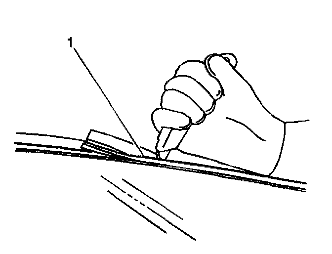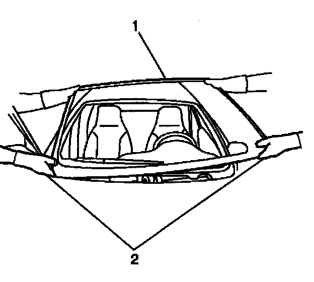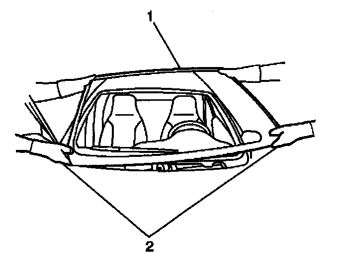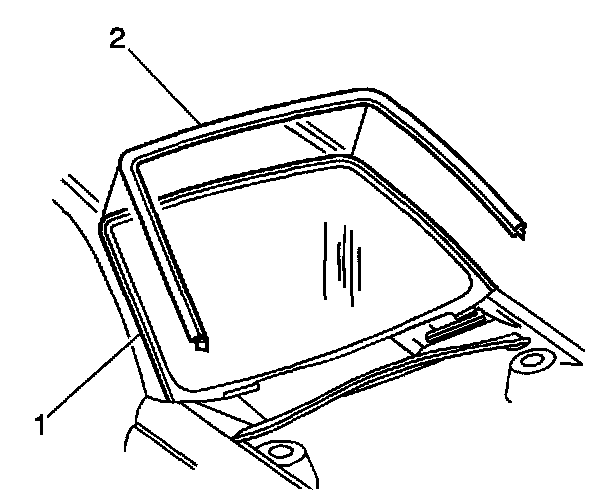 Important: The windshield reveal molding (2) is a one piece molding and fills the cavities between the body and windshield (1). If the windshield reveal molding (2) is stretched or damaged it can not be reused.