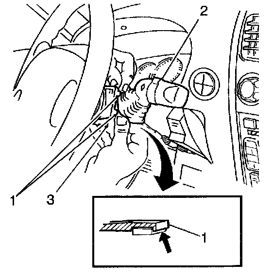 3. Press the 2 tabs (1) that retain the wiper control switch (2) to the column (3).