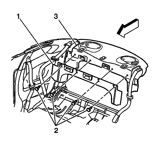 9. With the front of the trim panel (3) lifted up, slide the panel forward in vehicle to remove from the rear shelf.