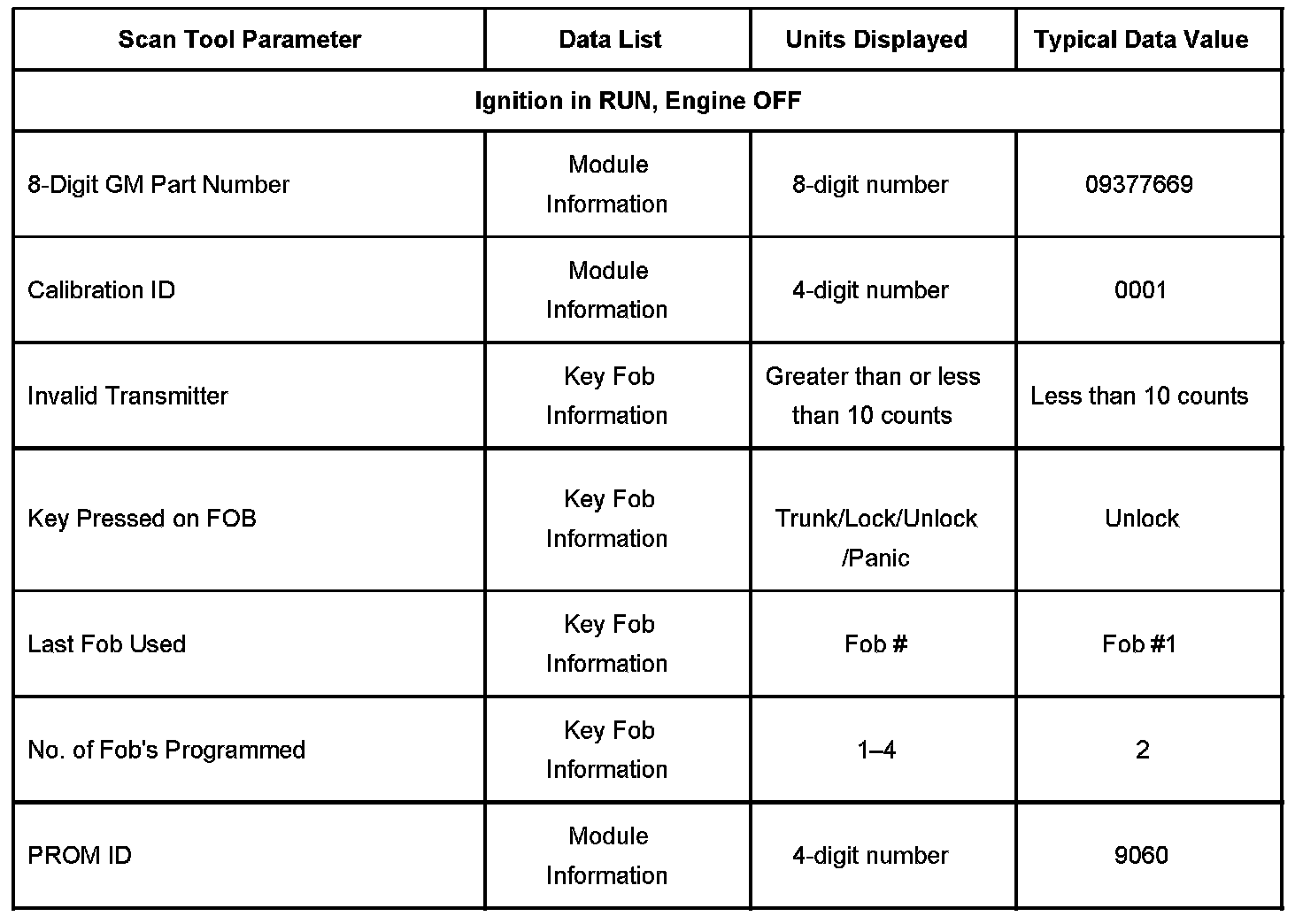 The Keyless Entry Scan Tool Data List contains all of the keyless entry related parameters that are available on the scan tool. The parameters in the list are arranged in alphabetical order. The column, Data List, indicates the location of the parameter within the scan tool menu selections. Use the Keyless Entry Scan Tool Data List as directed by a diagnostic table or in order to supplement the diagnostic procedures. Begin all of the diagnostic procedures with Diagnostic System Check - Remote Keyless Entry. Use the Scan Tool Data List only after the following is determined: