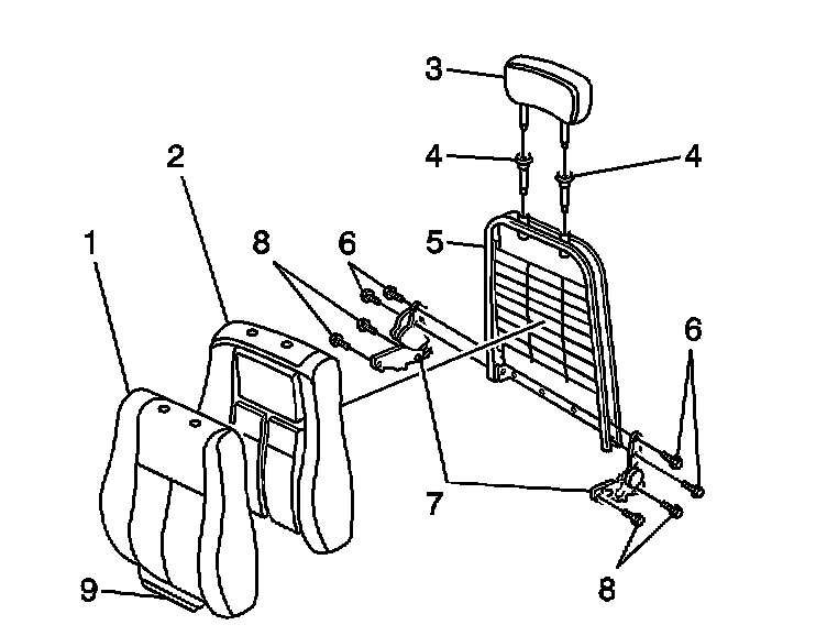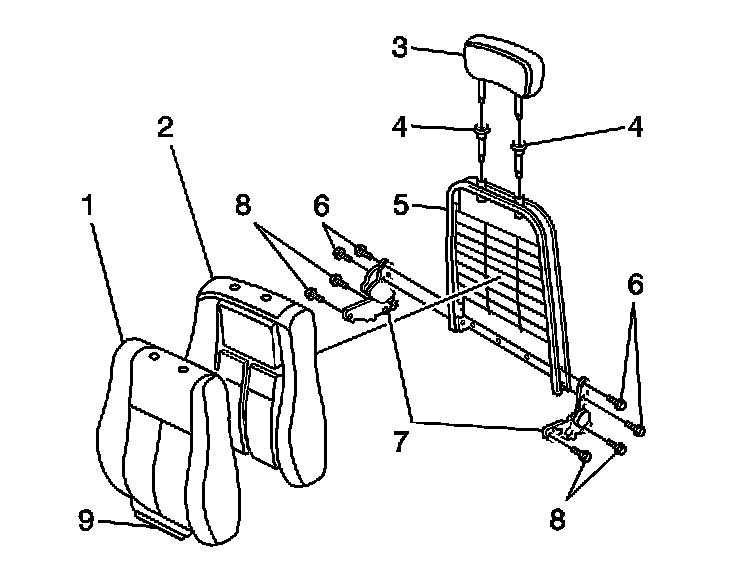 2. Remove the seat back pad (2) from the seat back frame (5).