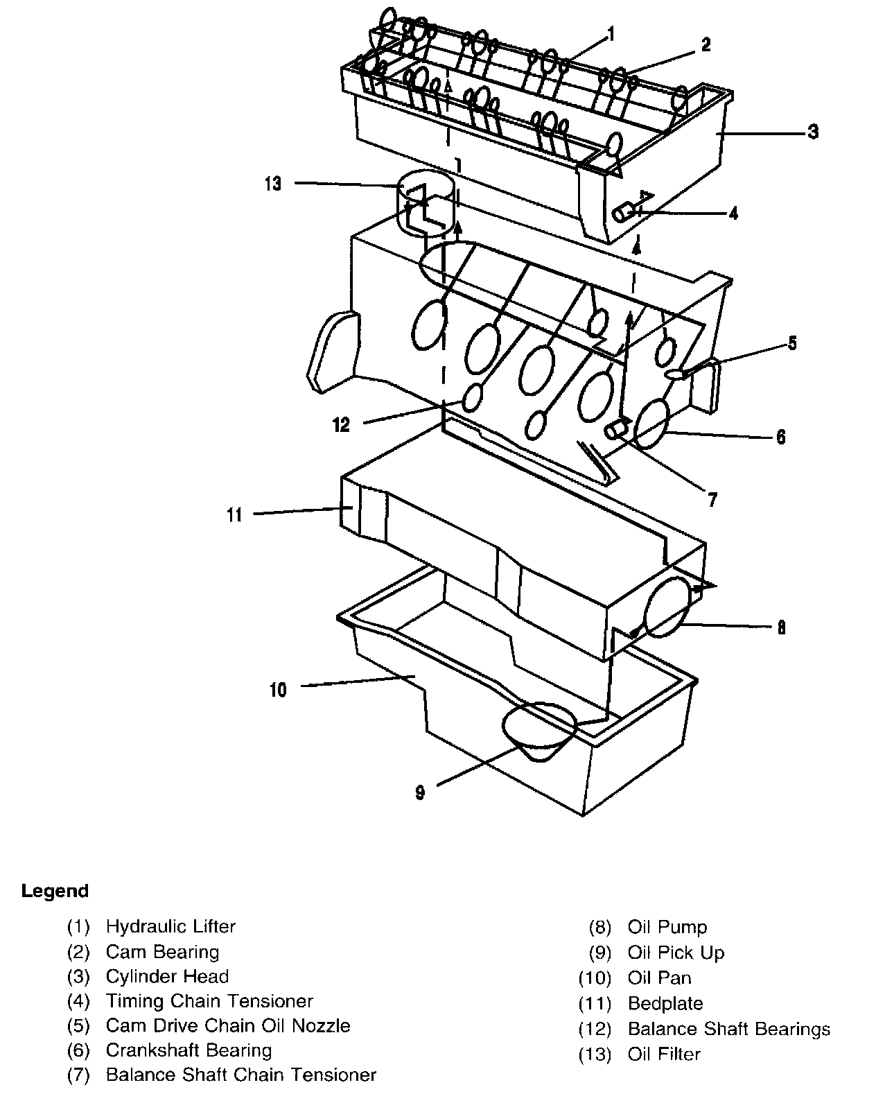 Oil is applied under pressure to the crankshaft, connecting rods, balance shaft assembly, camshaft bearing surfaces, valve lifters and timing chain hydraulic tensioner. All other moving parts are lubricated by gravity flow or splash. Oil enters the gerotor type oil pump thorough a fixed inlet screen. The oil pump is driven by the crankshaft. The oil pump body is within the engine front cover. The pressurized oil from the pump passes through the oil filter. The oil filter is located on the right (front) side of the engine block. The oil filter is housed in a casting that is integrated with the engine block. The oil filter is a disposable cartridge type. A by-pass valve in the filter cap allows continuous oil flow in case the oil filter should become restricted. Oil then enters the gallery where it is distributed to the balance shafts, crankshaft, camshafts and camshaft timing chain oiler nozzle. The connecting rod bearings are oiled by constant oil flow passages through the crankshaft connecting the main journals to the rod journals. A groove around each upper main bearing furnishes oil to the drilled crankshaft passages. The pressurized oil passes through the cylinder head restrictor orifice into the cylinder head and then into each camshaft feed gallery. Cast passages feed each hydraulic element adjuster and drilled passages feed each camshaft bearing surface. An engine oil pressure switch or sensor is installed at the end. Oil returns to the oil pan through passages cast into the cylinder head. The timing chain lubrication drains directly into the oil pan.