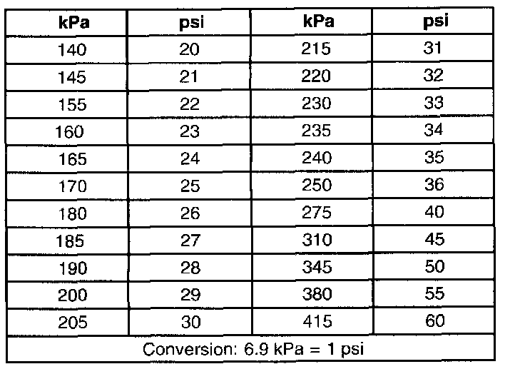 Inflation Pressure Conversion (Kilopascals to PSI)