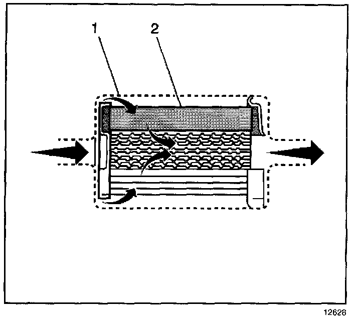 The fuel filter is located on the fuel feed pipe, between the fuel pump and the fuel injectors. The paper filter element (2) traps particles in the fuel that may damage the fuel injection system. The filter housing (1) is made to withstand maximum fuel system pressure, exposure to fuel additives, and changes in temperature.