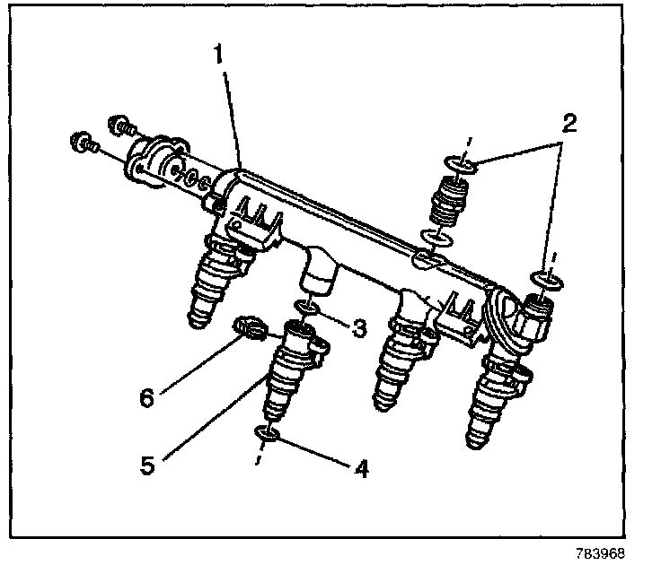 The fuel rail assembly (1) attaches to the engine intake manifold. The fuel rail assembly performs the following functions: