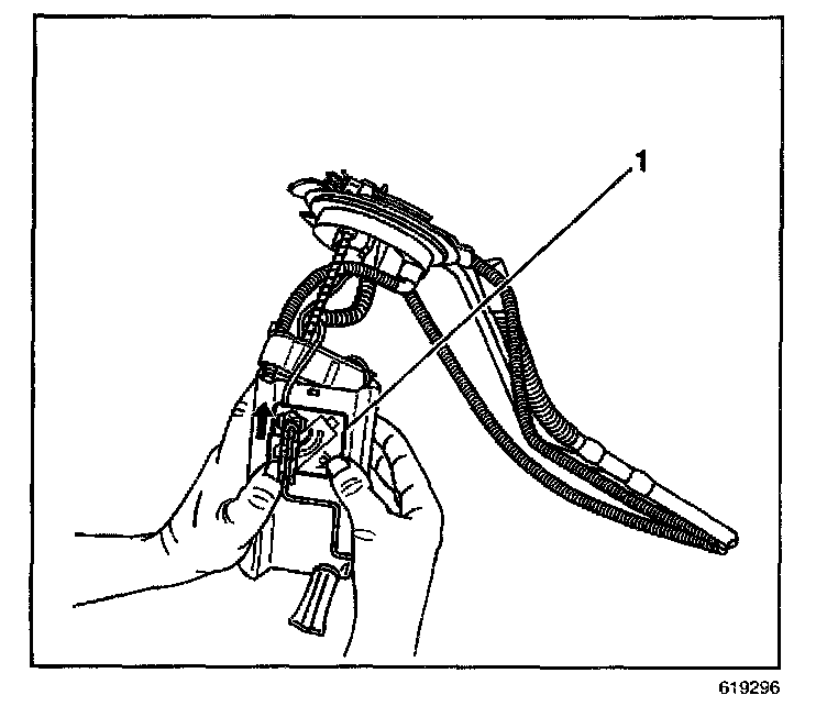 5. Depress the tab on the fuel level sensor (1) while sliding up and out of the housing.