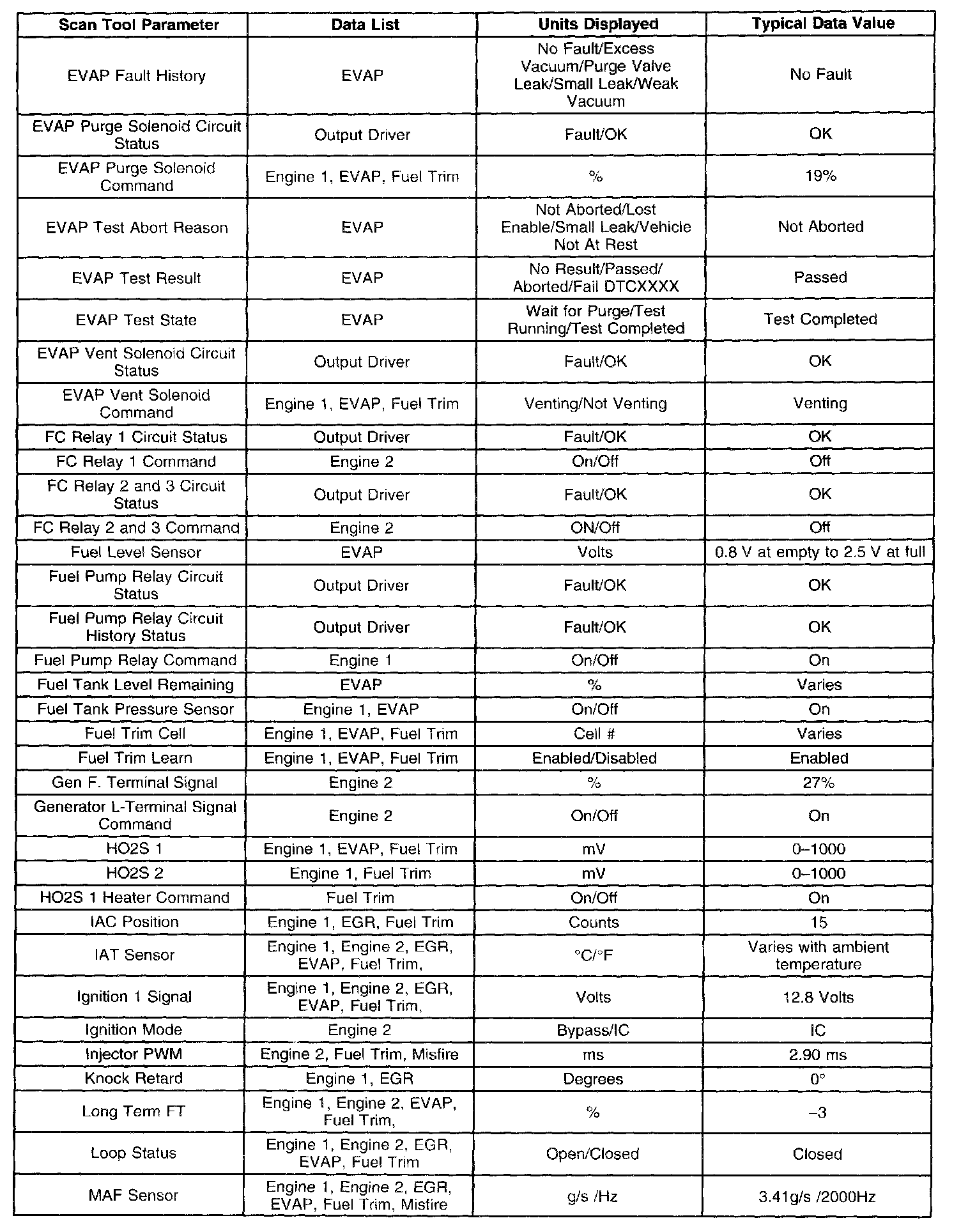 - Engine Data 1-Contains general information regarding fuel delivery, idle air control (IAC) position, heated oxygen sensor (HO2S1), HO2S2, and other basic engine operating conditions.