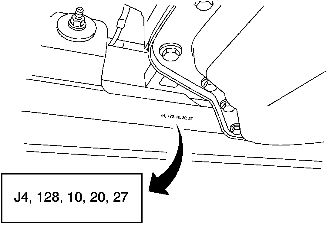 2. Locate the date code stamped on the frame assembly near the transmission pan as shown. For this inspection we are looking for frames made during a certain time frame on one particular day this year. The date codes involved are J4, 128, 10, 20, 27 to J4, 128, 13, 25, 54 A date code is broken down as follows: J4 = Calendar Year 2004 128 = Day 128 (May 7th) 10 = Hour (10 am) 20 = Minute (10:20 am) 27 = Second (10:20 am and 27 seconds)