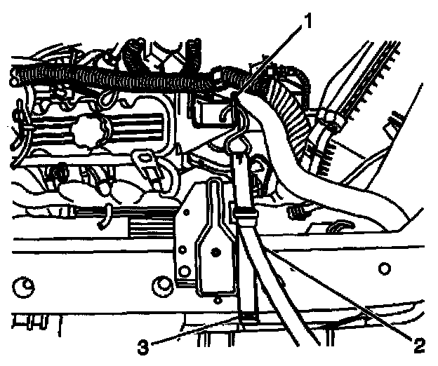 5. Install the J41131 (2) to the engine mount strut bracket (1) and the upper radiator support (3).