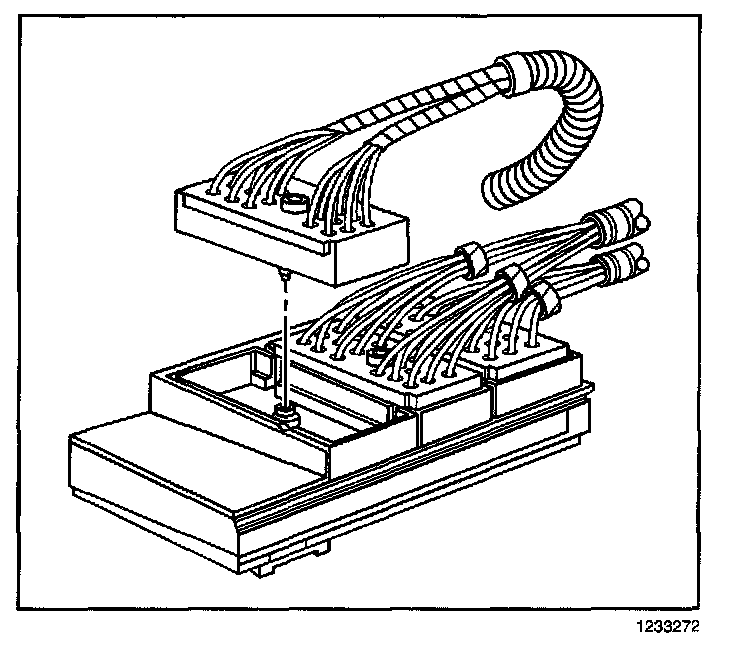 5. Loosen the bolts (1) retaining the engine, IP and forward lamp wiring harness connectors to the junction block.