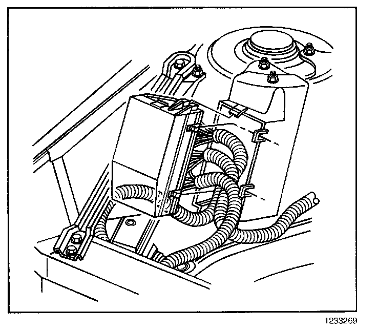 7.2. Lift the BEC housing to release the lower tab from the strut tower.