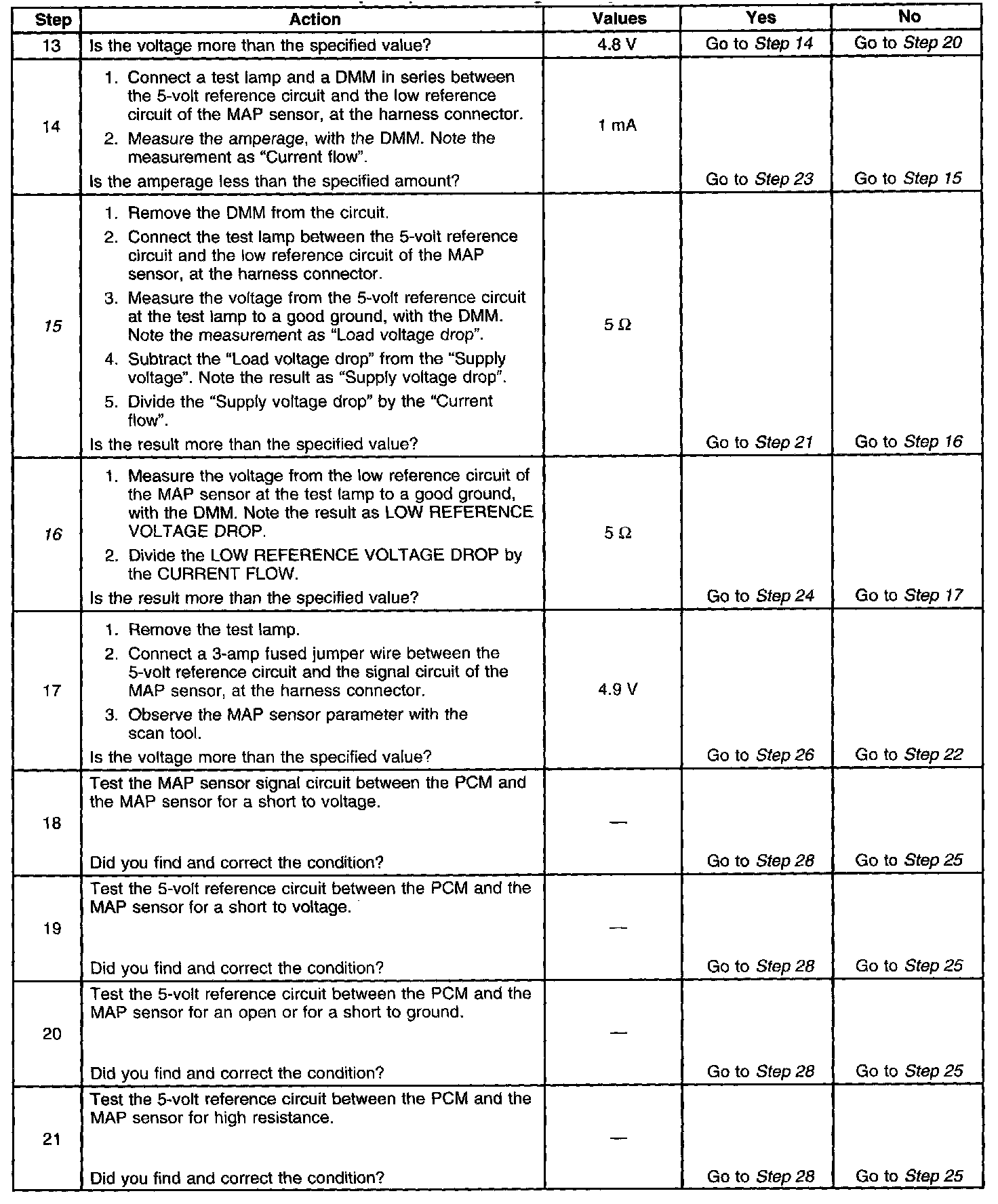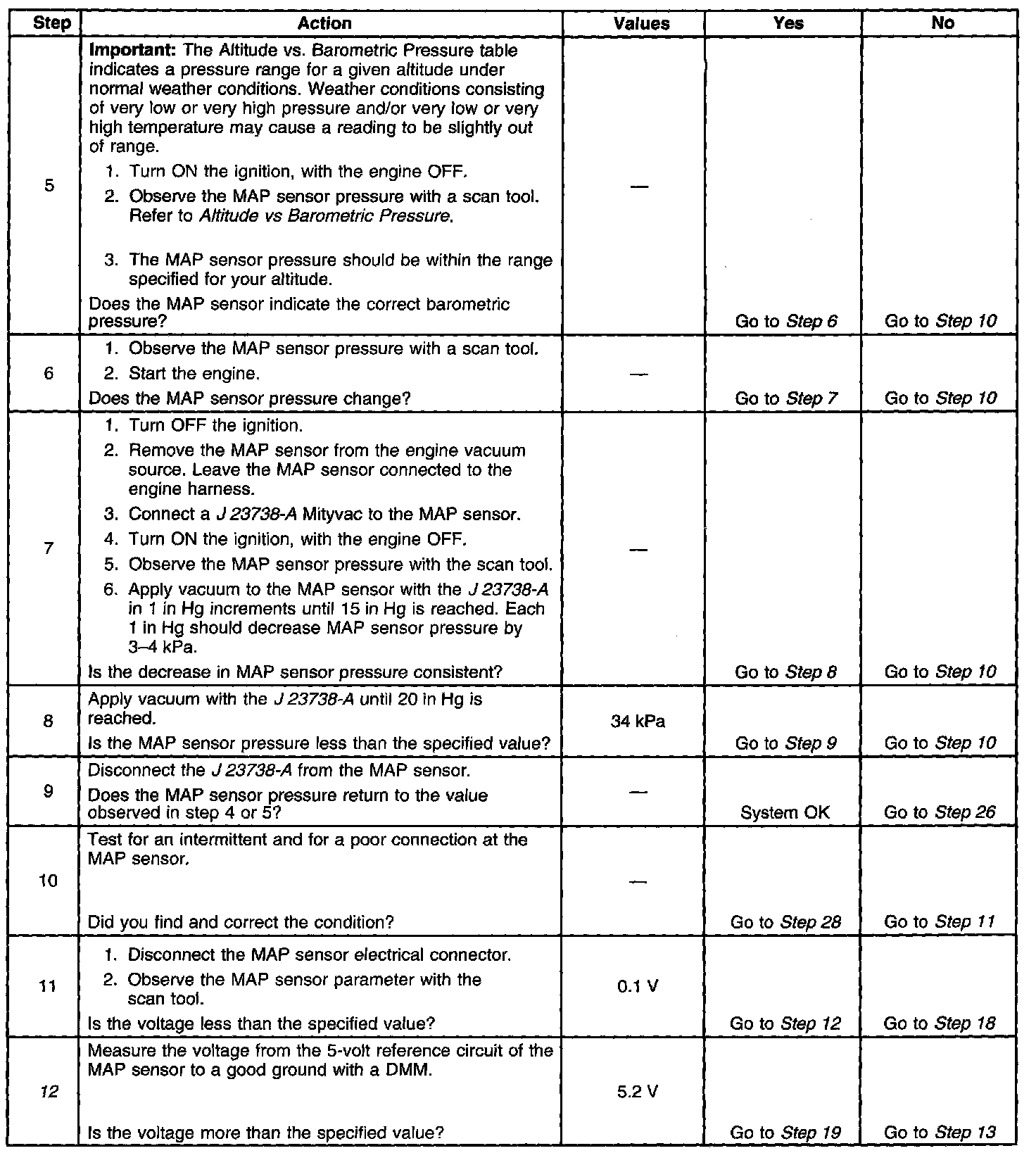 The manifold absolute pressure (MAP) sensor responds to changes in intake manifold pressure which gives an indication of the engine load. The MAP sensor has a 5-volt reference circuit, a low reference circuit, and a signal circuit. The powertrain control module (PCM) supplies 5 volts to the MAP sensor on the 5-volt reference circuit and provides a ground on the low reference circuit. The MAP sensor provides a signal to the PCM on the MAP sensor signal circuit, which is relative to the pressure changes in the manifold. With low MAP, such as during idle or deceleration, the PCM should detect a low MAP sensor signal voltage. With high MAP, such as ignition ON, engine OFF or wide open throttle (WOT), the PCM should detect a high MAP sensor signal voltage. This MAP sensor will indicate pressure between 10 and 104 kPa. The MAP sensor is also used in order to calculate the barometric pressure (BARO) when the ignition switch is turned ON, with the engine OFF. The BARO reading may also be updated whenever the engine is operated at WOT. The PCM monitors the MAP sensor signal for voltage outside of the normal range. If the PCM detects a MAP sensor signal voltage that is excessively low, DTC P0107 sets. If the PCM detects a MAP sensor signal voltage that is excessively high DTC P0108 sets.
