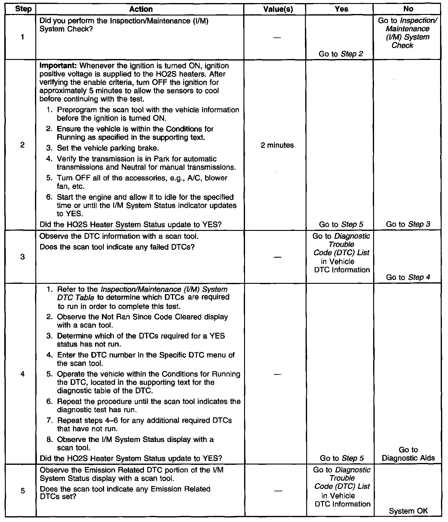 The purpose of this test is to satisfy the enable criteria necessary to execute inspection/maintenance (I/M) readiness diagnostics for the heated oxygen sensor (HO2S) system. The test may be used to set the I/M System Status to YES. The I/M System Status display on the scan tool provides an indication of whether the control module has completed the required tests. The I/M System Status does not indicate that the tests have passed or failed. When all of the diagnostics for a specific system have run and passed, the I/M System Status will update to YES. If a test for a specific system has failed, the I/M System Status will update to YES, indicating a determination was made, even if all of the other tests for that system have not run.