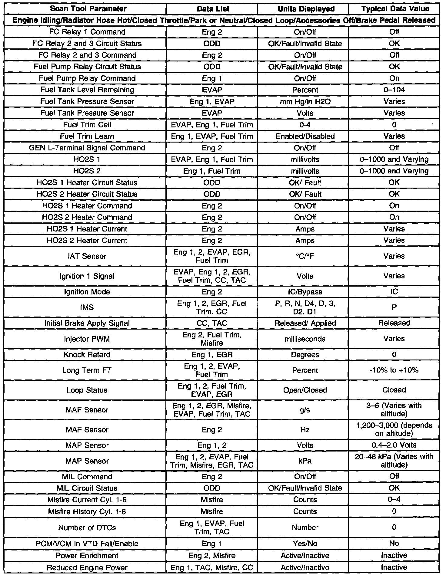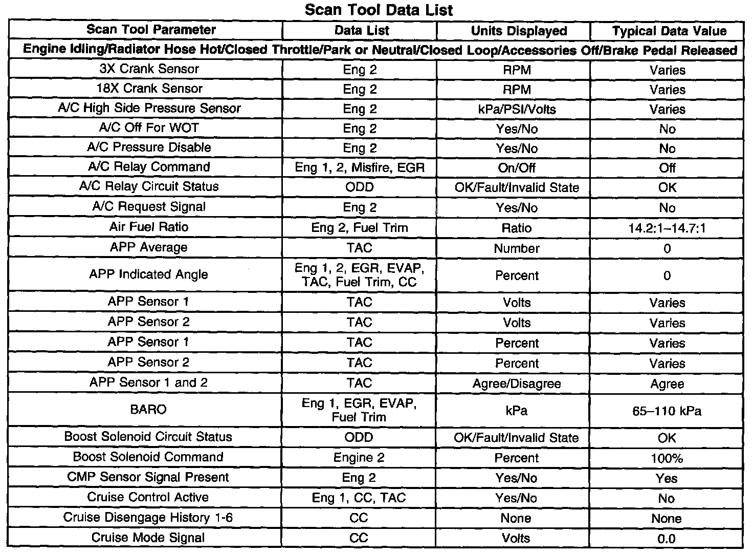 The Engine Scan Tool Data List contains all engine-related parameters that are available on the scan tool. The list is arranged in alphabetical order. A given parameter may appear in any one of the data lists, and in some cases may appear more than once, or in more than one data list in order to group certain related parameters together.