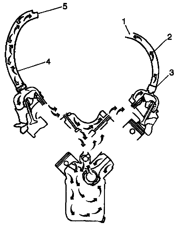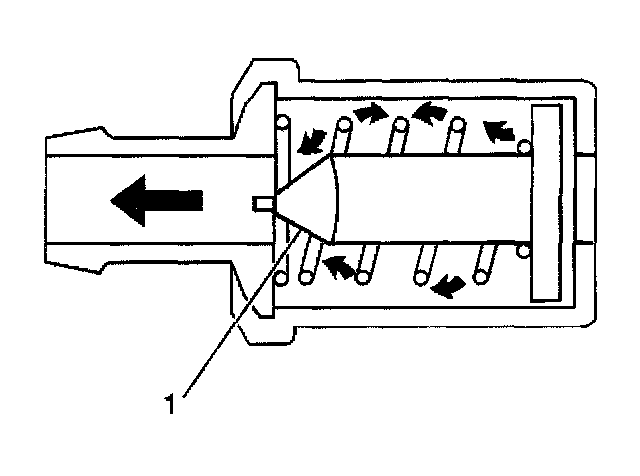 The primary control is through the crankcase ventilation valve (1) which meters the flow at a rate depending on inlet vacuum. To maintain idle quality, the crankcase ventilation valve restricts the flow when inlet vacuum is high. If abnormal operating conditions arise, the system is designed to allow excessive amounts of blow-by gases to back flow through the crankcase vent into the throttle body to be consumed by normal combustion.