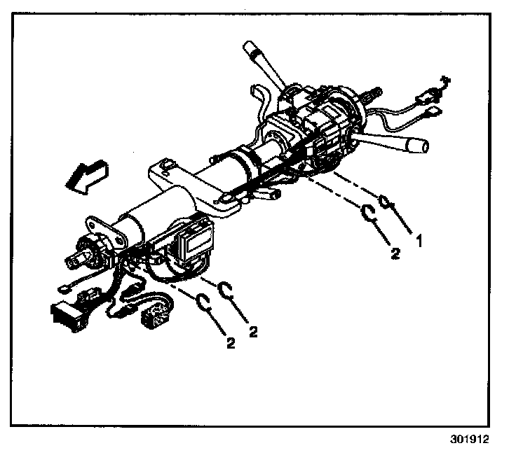 3. Remove the steering column wiring harness tie straps (1,2).