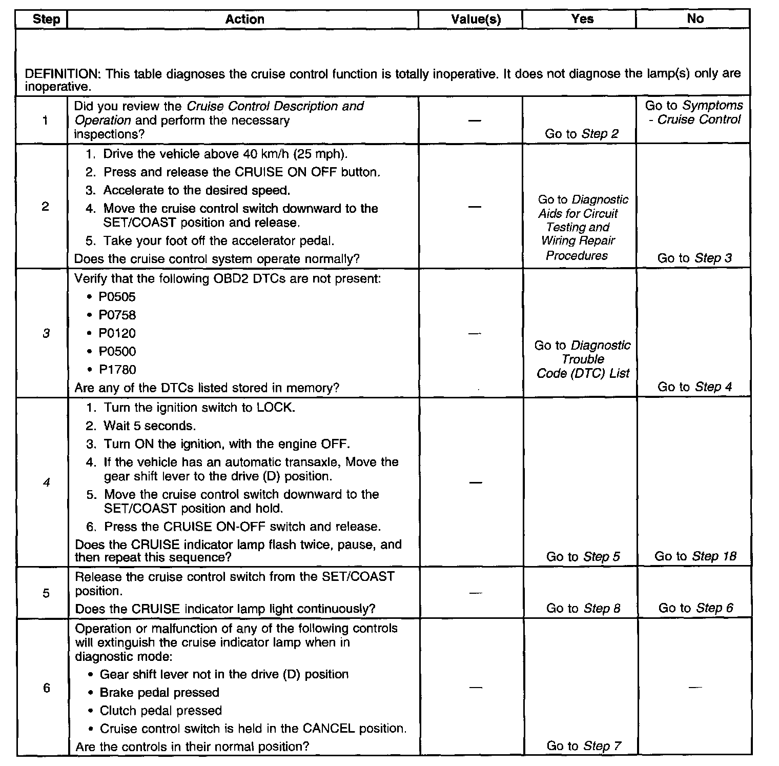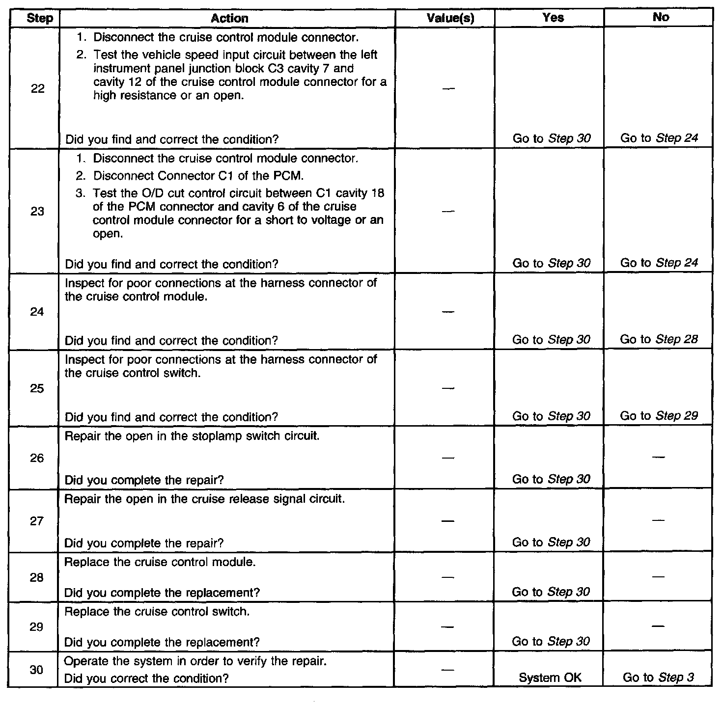 4. This step places the cruise control module in a functional test mode to allow testing of the; Cruise control switch circuit, brake switch circuit, the vehicle speed sensor (VSS) circuit PNP switch circuit, if equipped, and the cruise release switch circuit, if equipped.