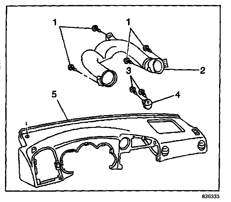3. Remove the upper air distribution duct (2) duct from the upper IP panel (5).